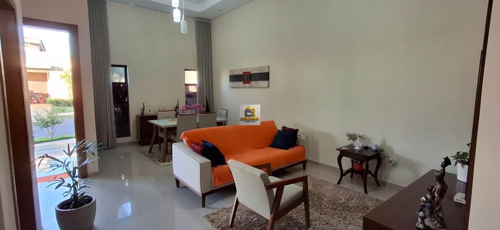Sala ampla com pé-direito de 4,5m, integrada a dois ambientes